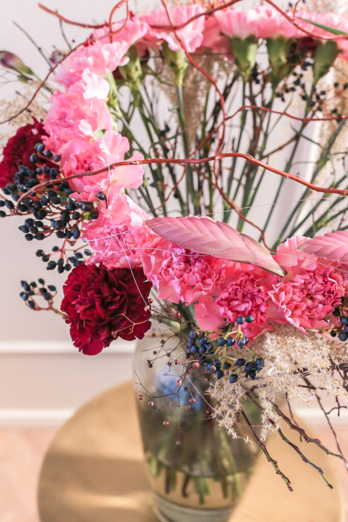 Neilikka on erittäin kestävä ja floristille mieluisa kukka työstää. Tässä kimpussa siitä on toteutettu ympyränmuotoinen kehä, jonka sisään muut leikkokukat on aseteltu.