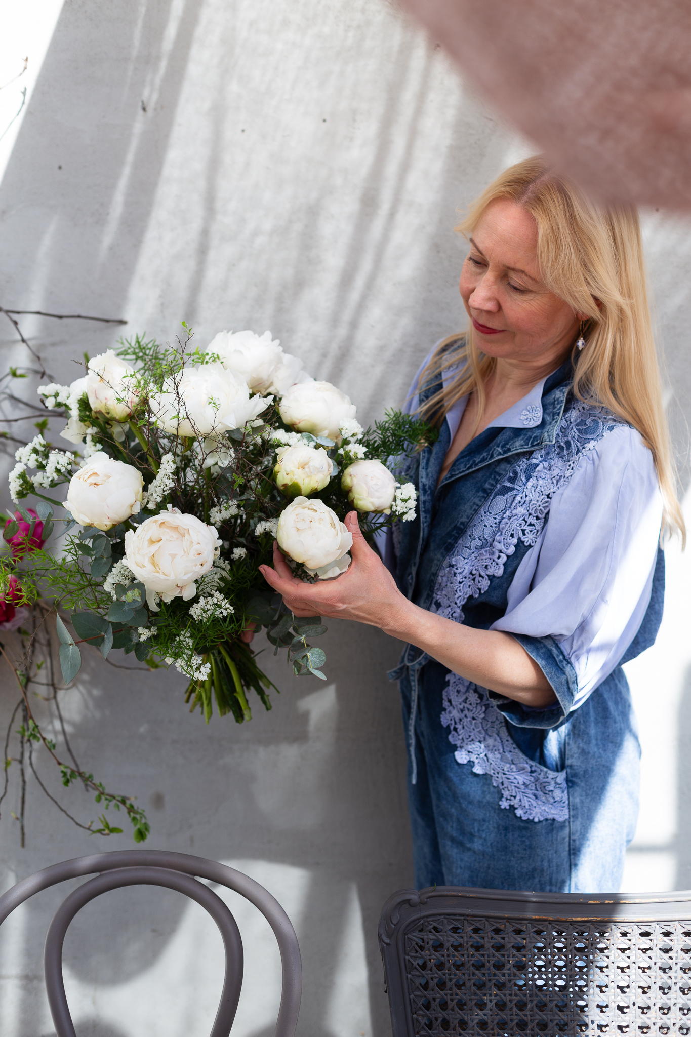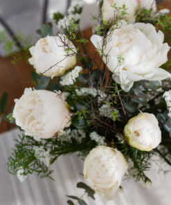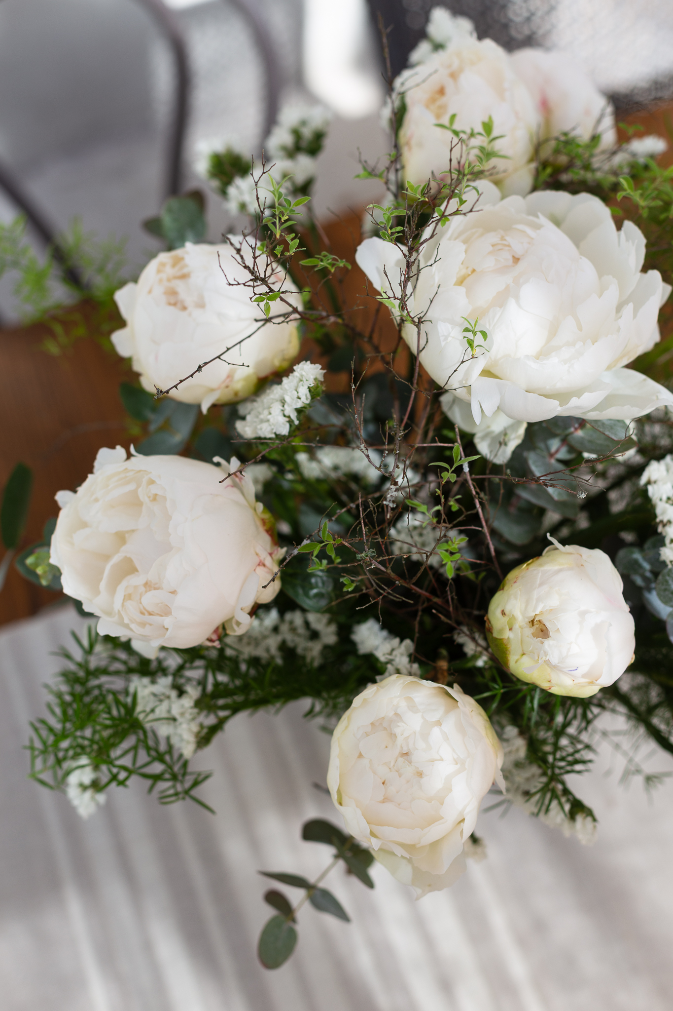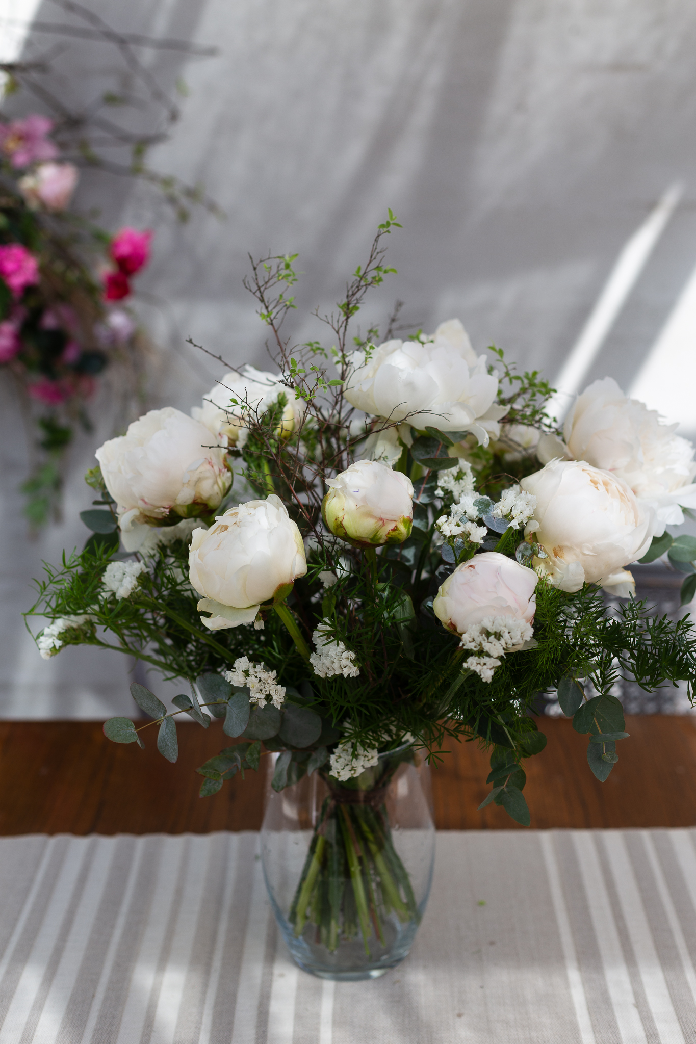 Näyttävä valkoinen kimppu pioneista. Lisäksi kevään vihreitä.