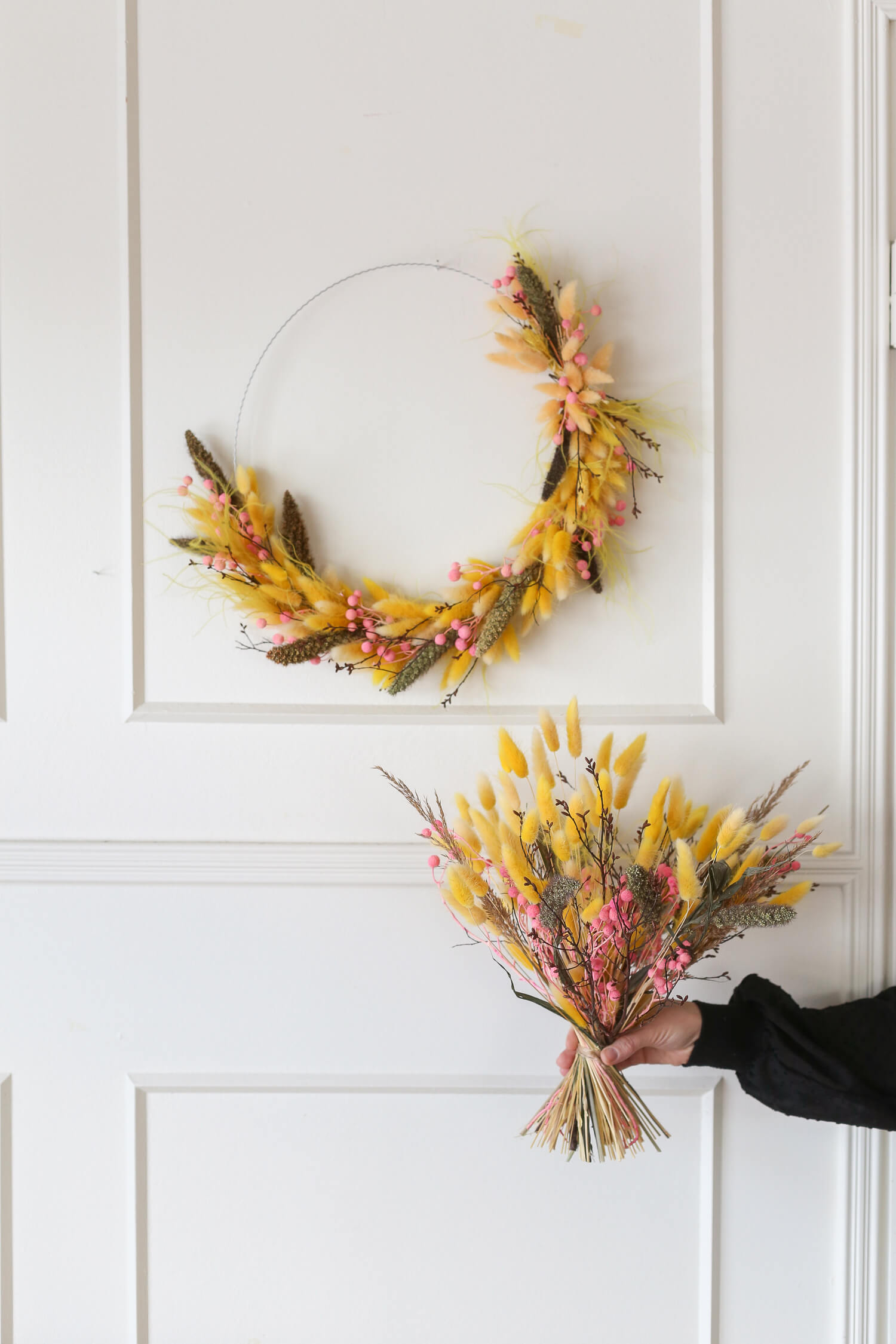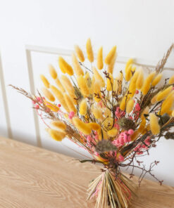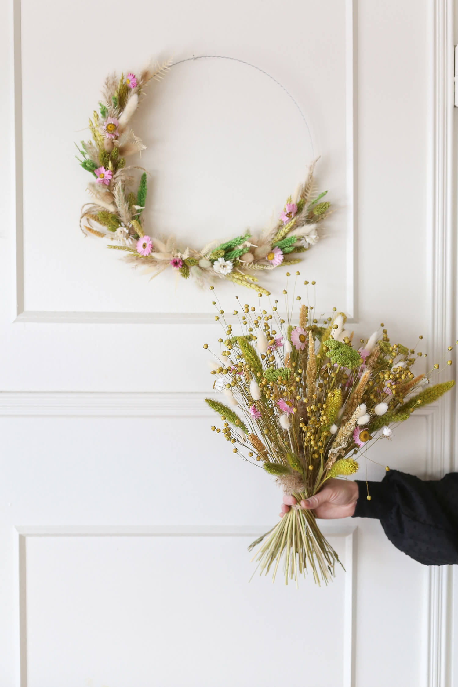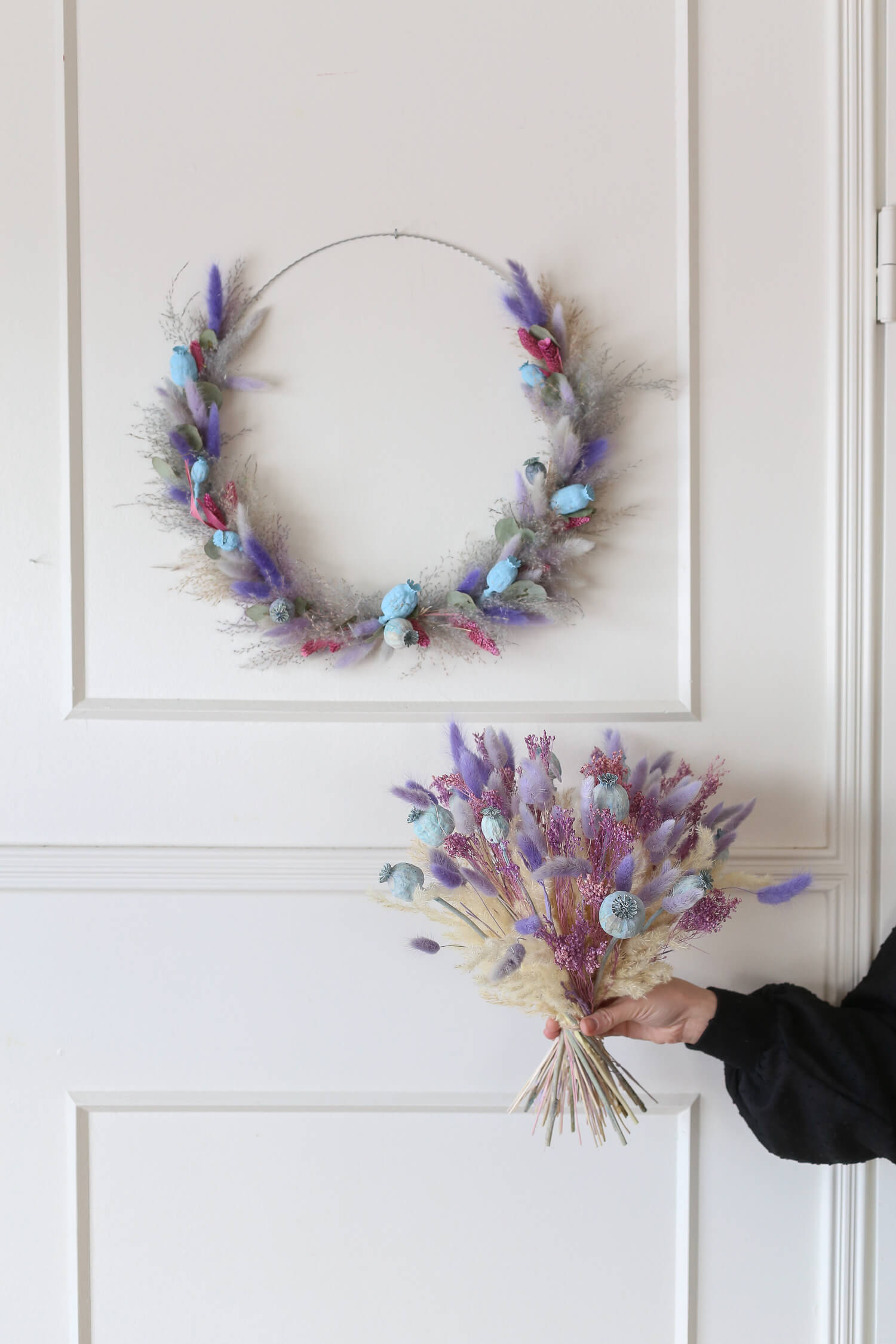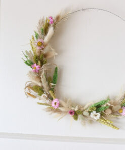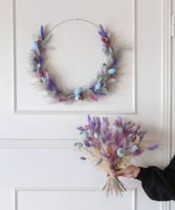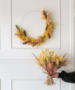 Samassa värimaailmassa on saatavana myös ihana kuivakukkakranssi, joka on valmistettu samoista kuivakukista kuin kimppu. Näillä tuotteilla voit luoda yhtenäisen ja harmonisen ilmeen sisustukseen tai lähettää kukat ystävälle ilahduttamaan heidän päiväänsä. (kranssin halkaisija 35cm)