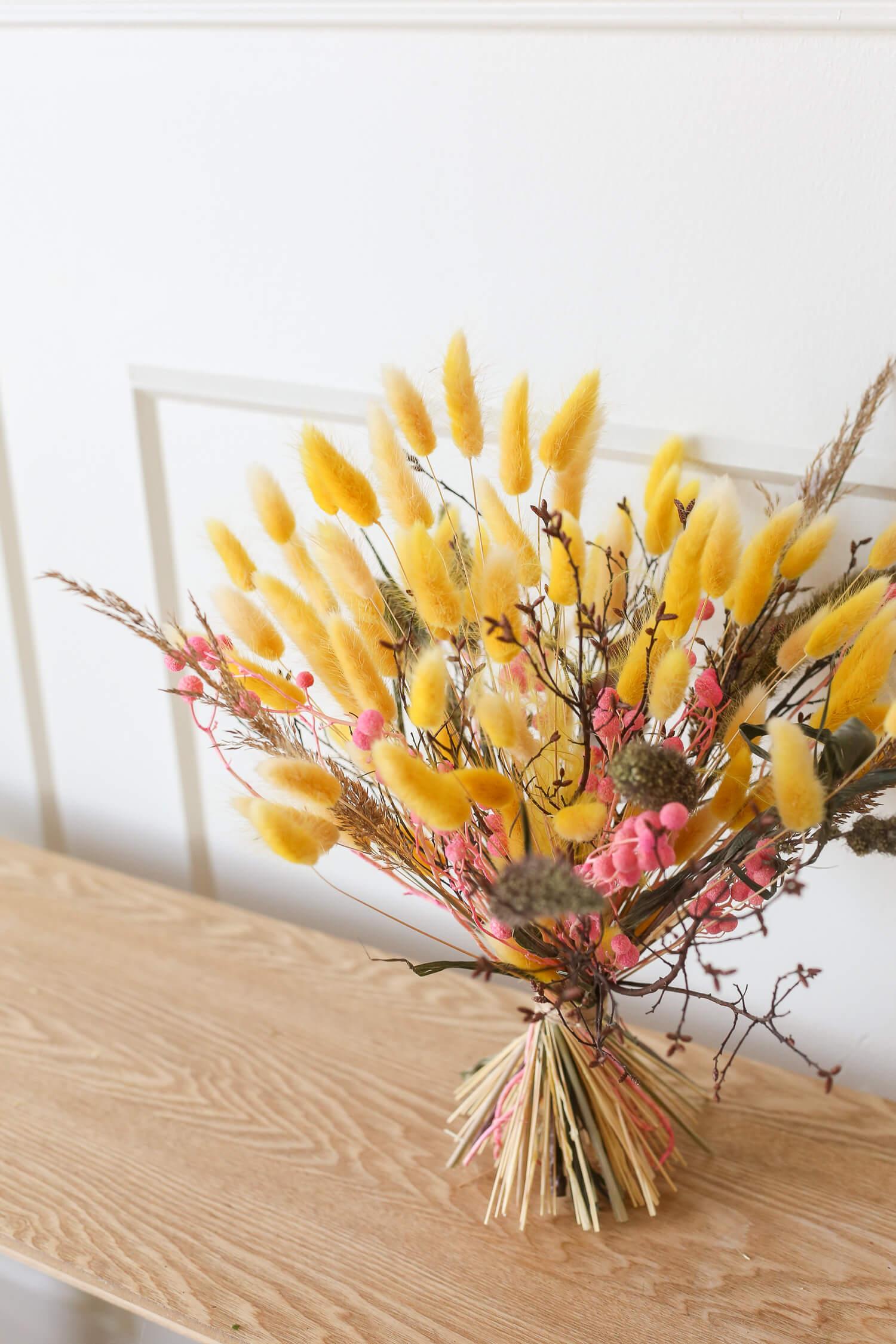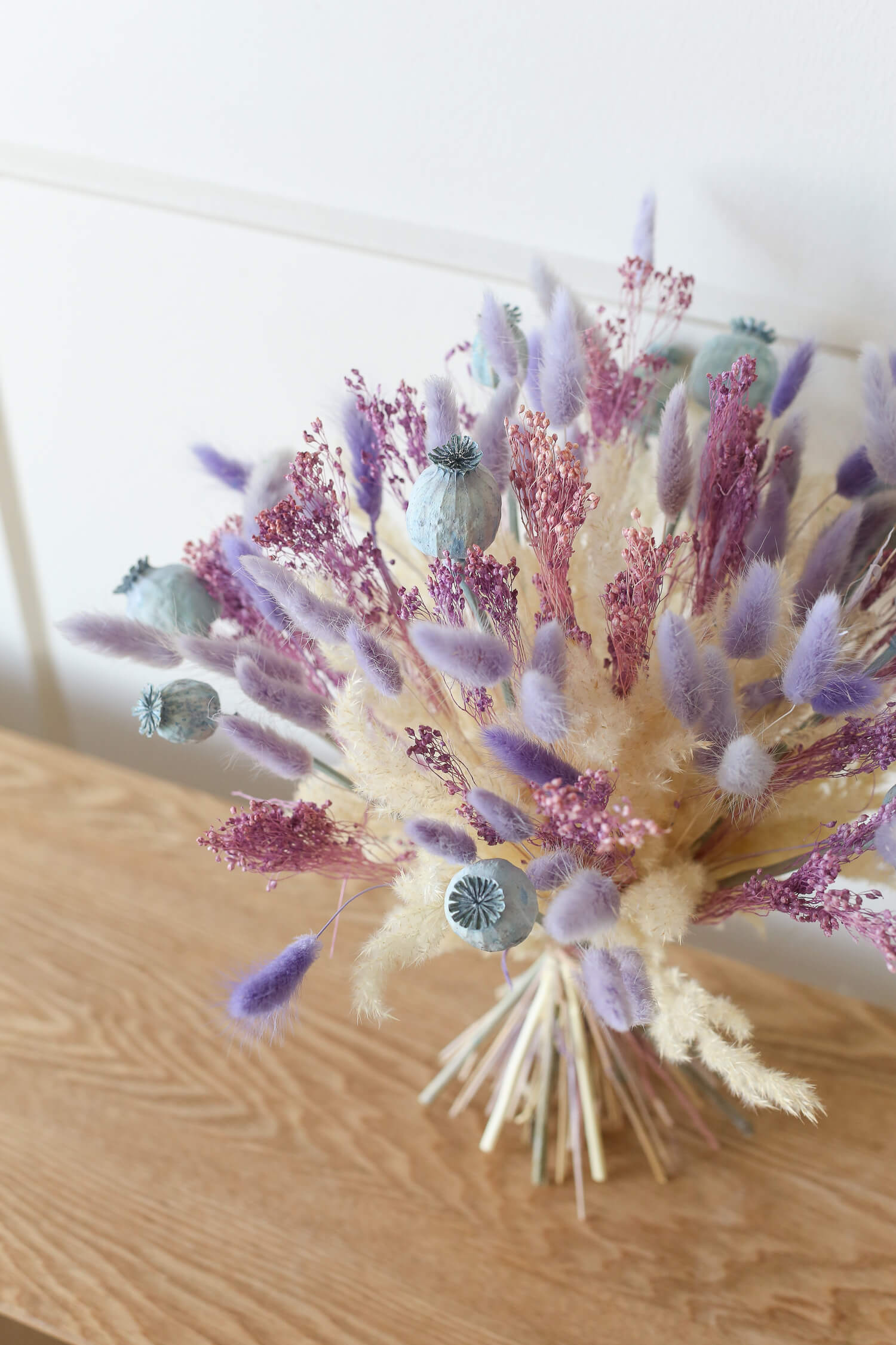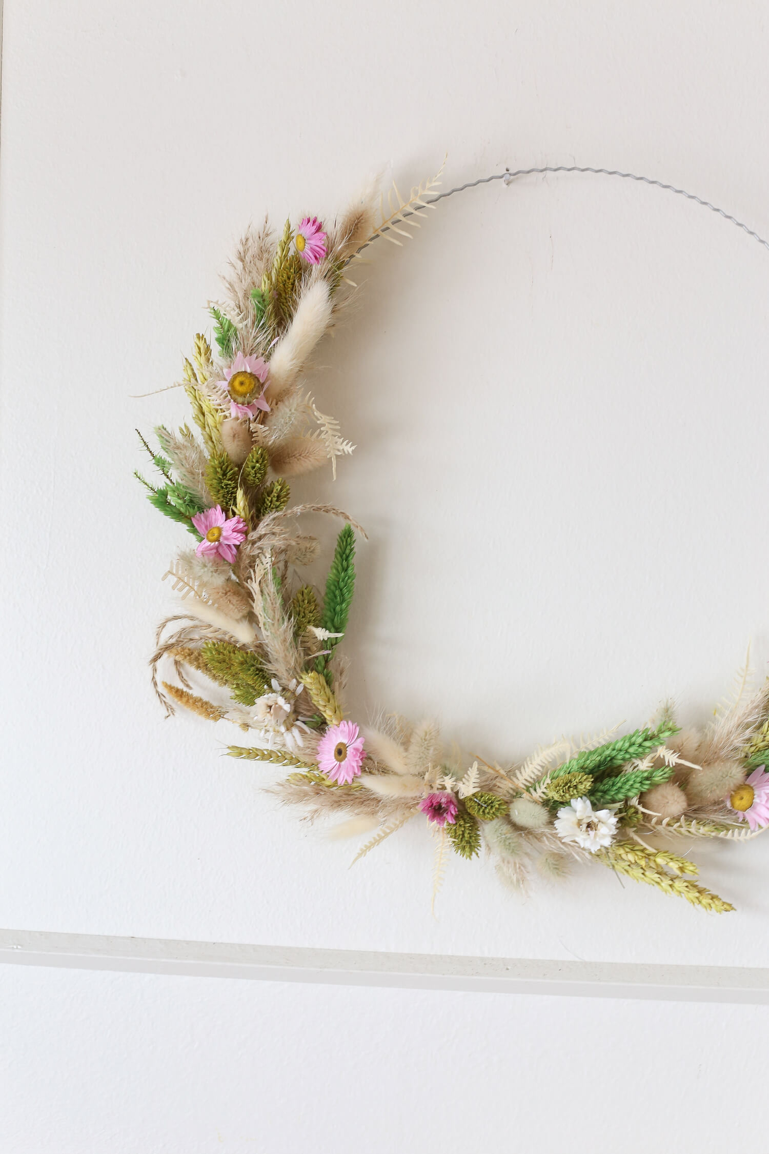 Samassa värimaailmassa on saatavana myös ihana kuivakukkakranssi, joka on valmistettu samoista kuivakukista kuin kimppu. Näillä tuotteilla voit luoda yhtenäisen ja harmonisen ilmeen sisustukseen tai lähettää kukat ystävälle ilahduttamaan heidän päiväänsä. (kranssin halkaisija 35cm)