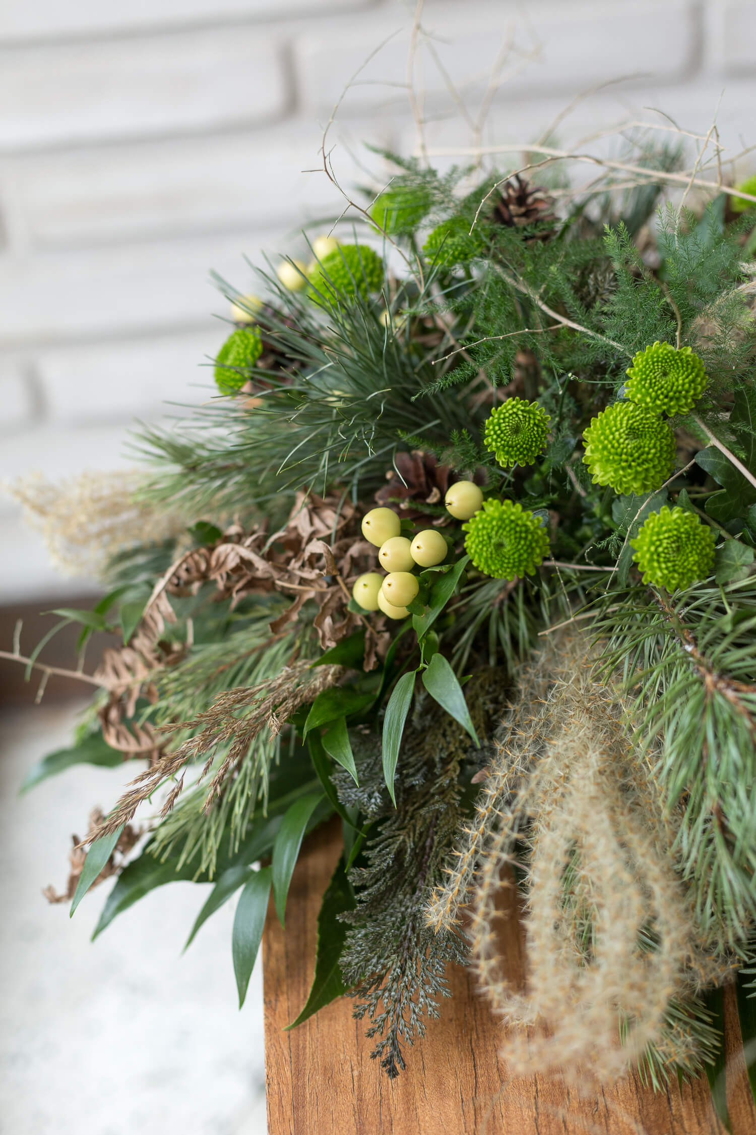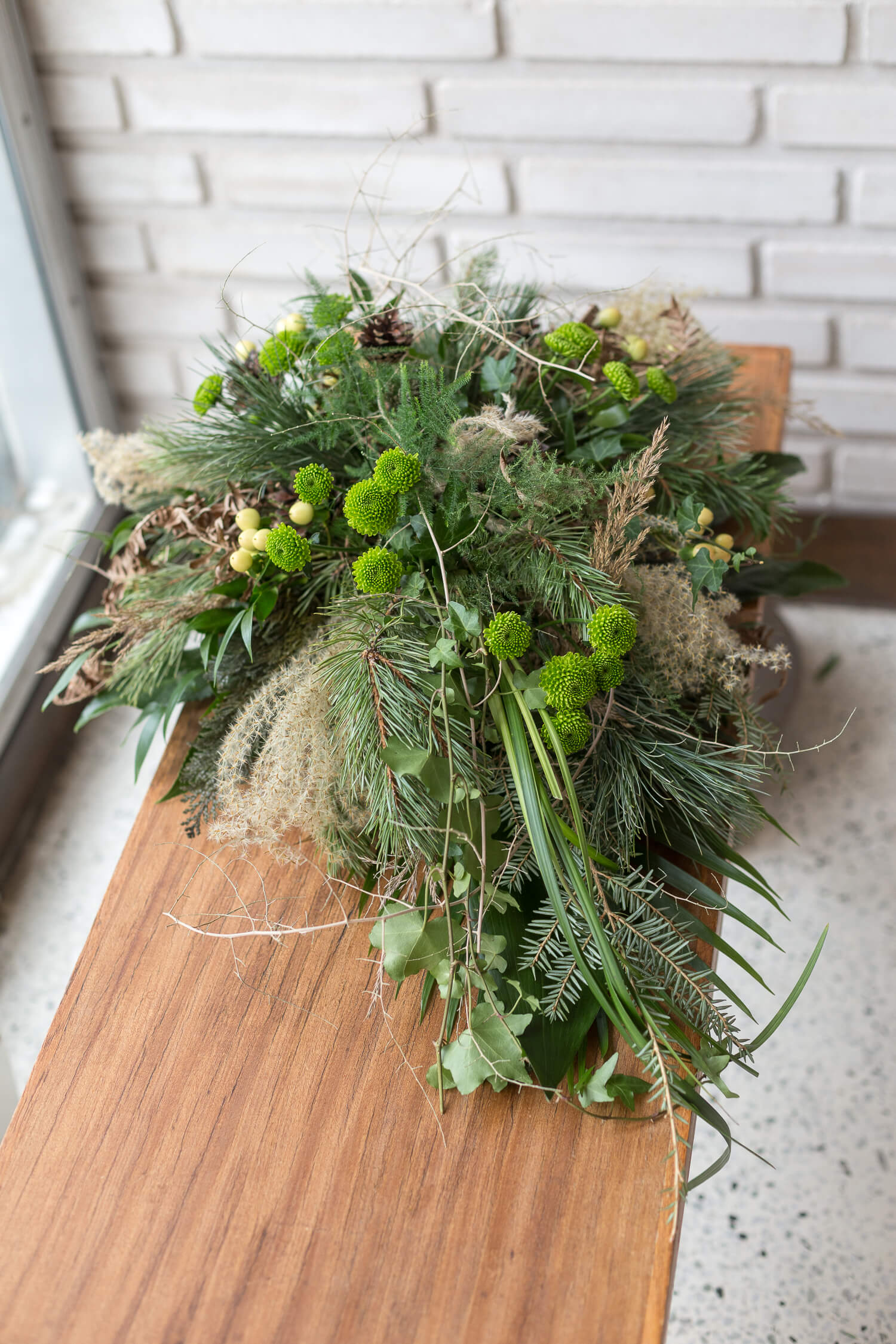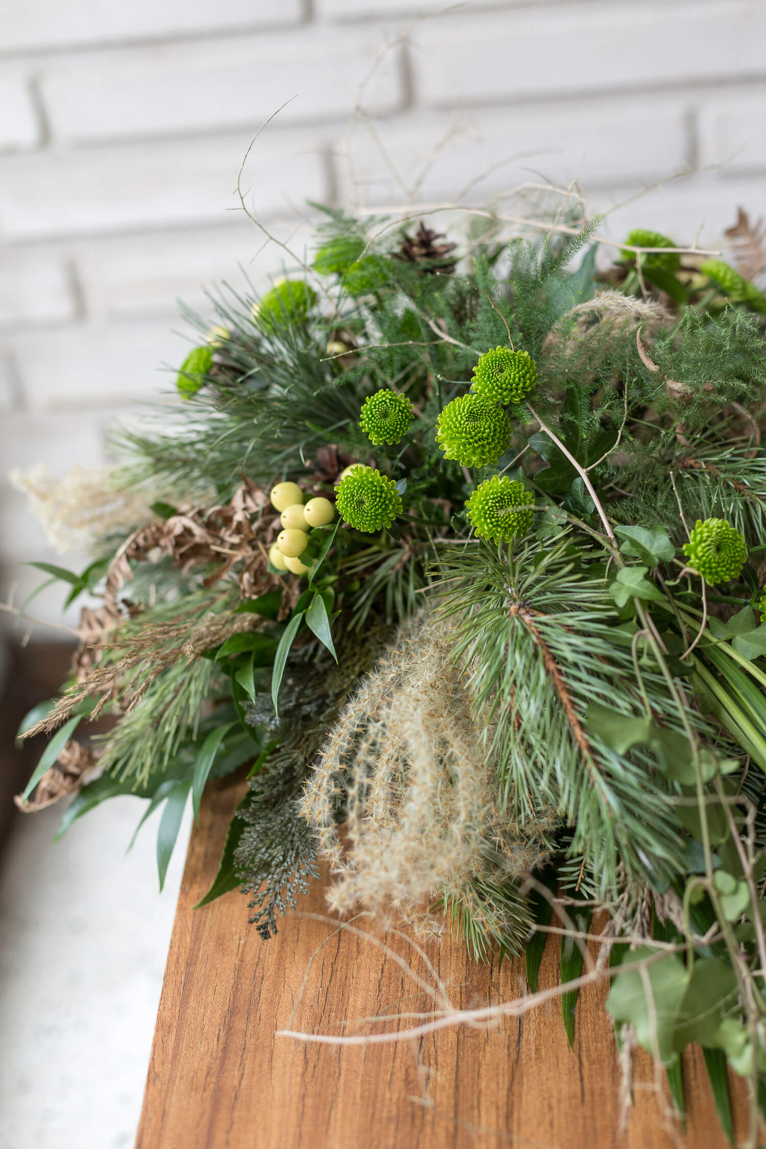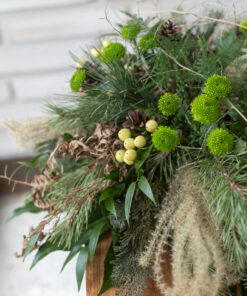 Surulaite, jossa on käytetty erilaisia luonnonmateriaaleja, kuten oksia ja havuja floristin valinnan sekä sesongin mukaan.