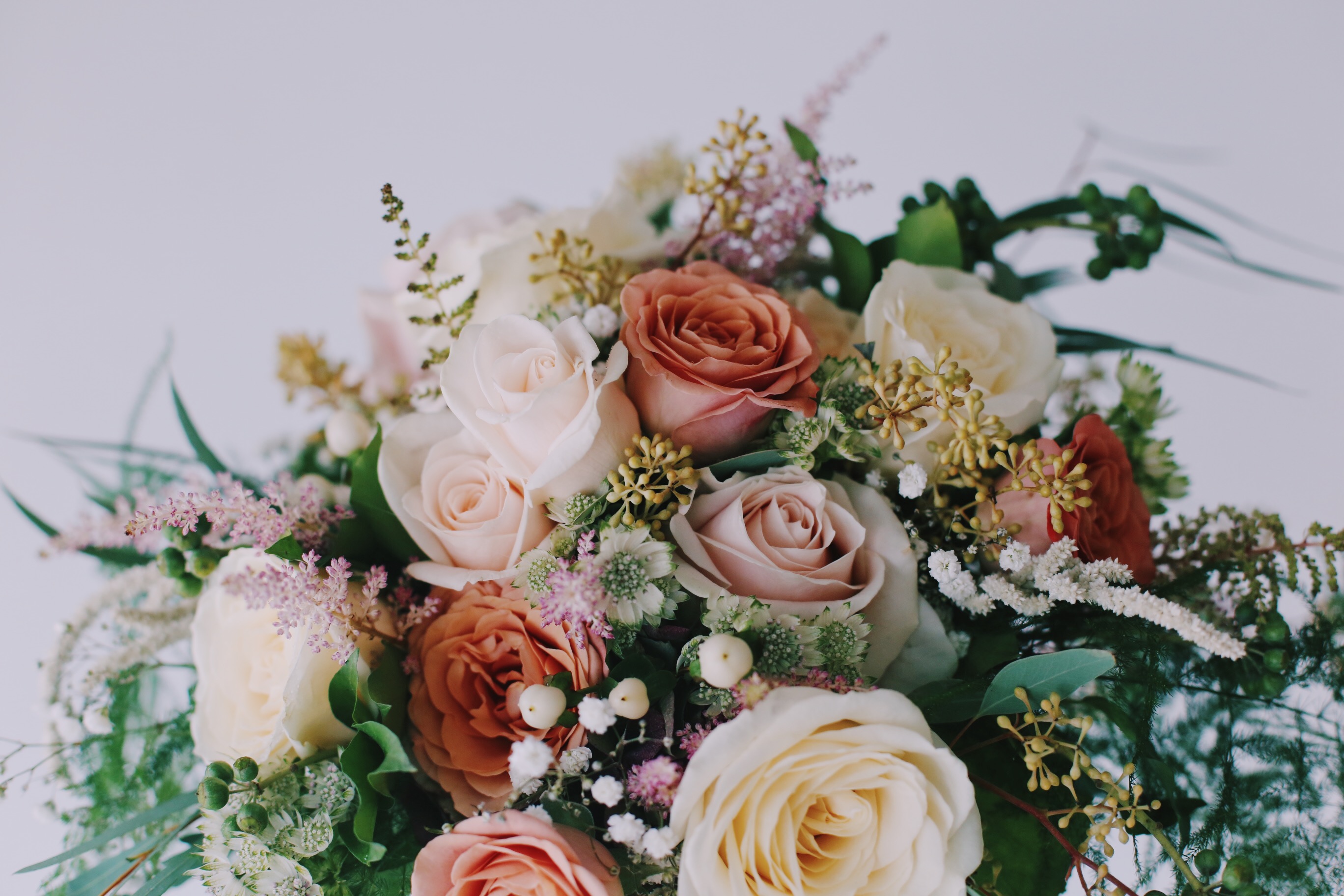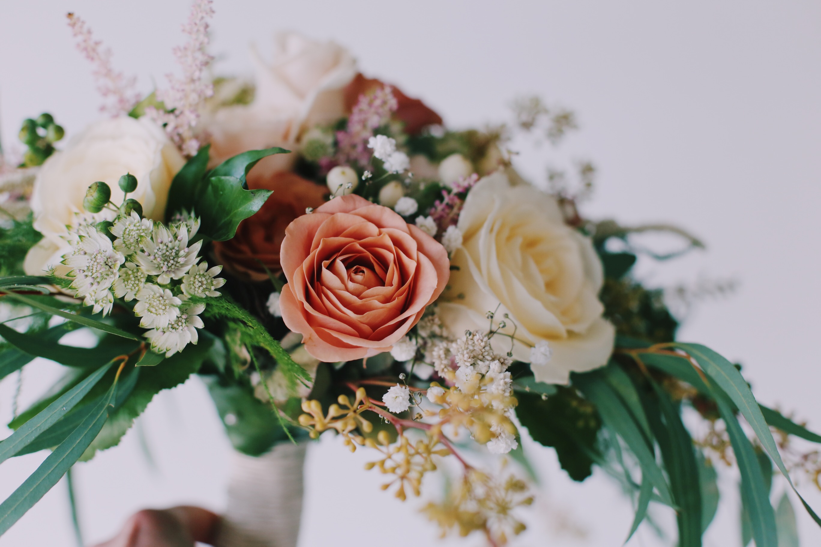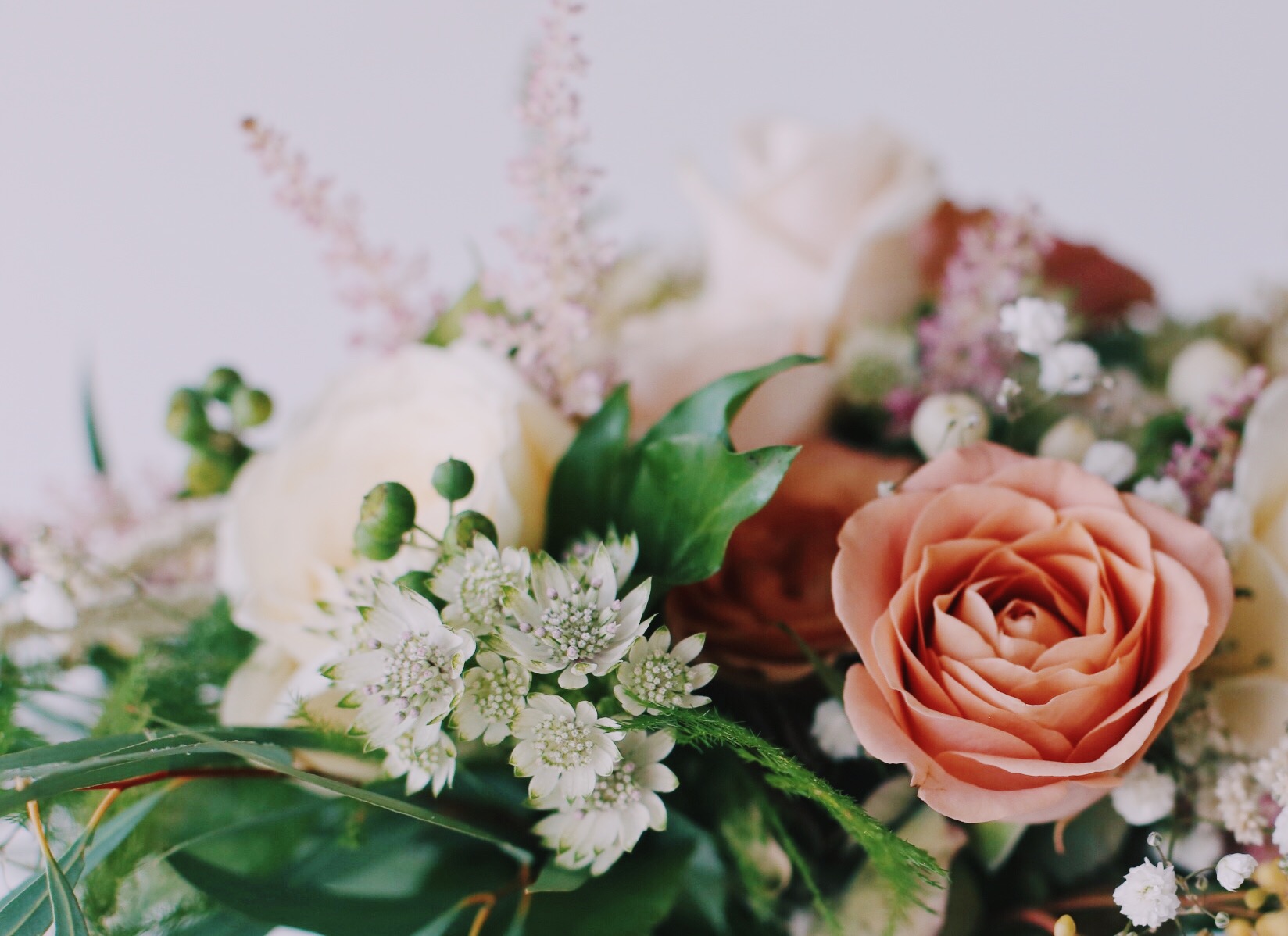 Morsiuskimpussa on erilaisia ruusulajikkeita, mm. rusehtava Capuccino, vaalea Avalanche, kerma Myllena. Lisäksi valkoista kuismanmarjaa (hypericum), valkoista tähtiputkea ( astrantia major) vaaleanpunaista jaloangervoa (astilbe arendsii), eukalyptuksen marjaa, harsokukkaa (gypsophila) ja erilaisia vihreitä.