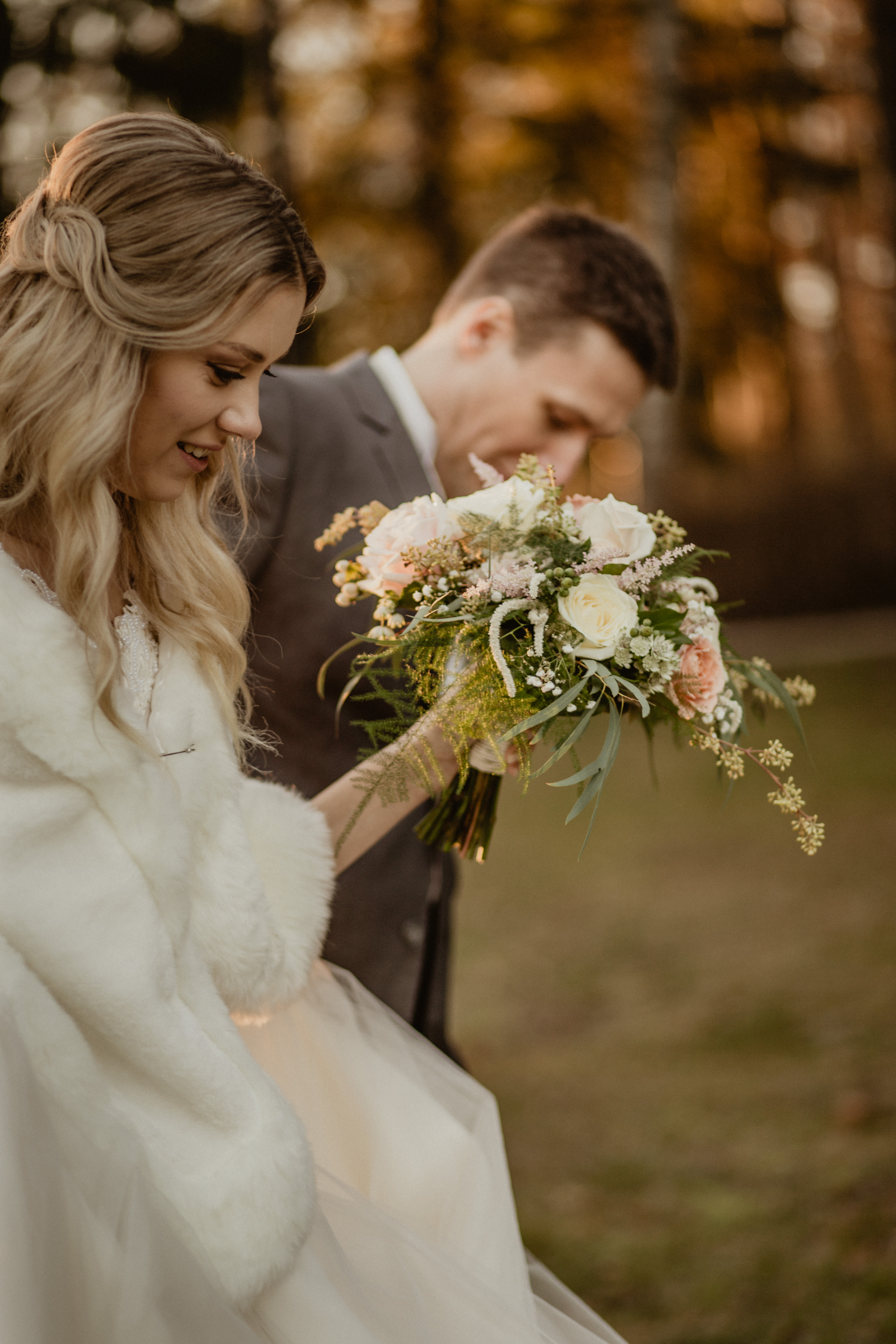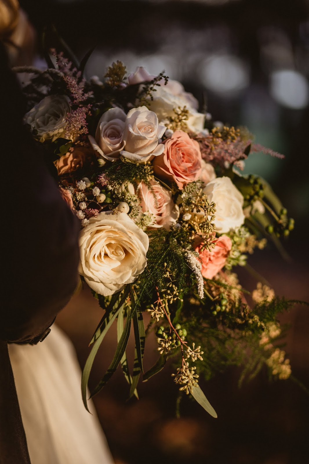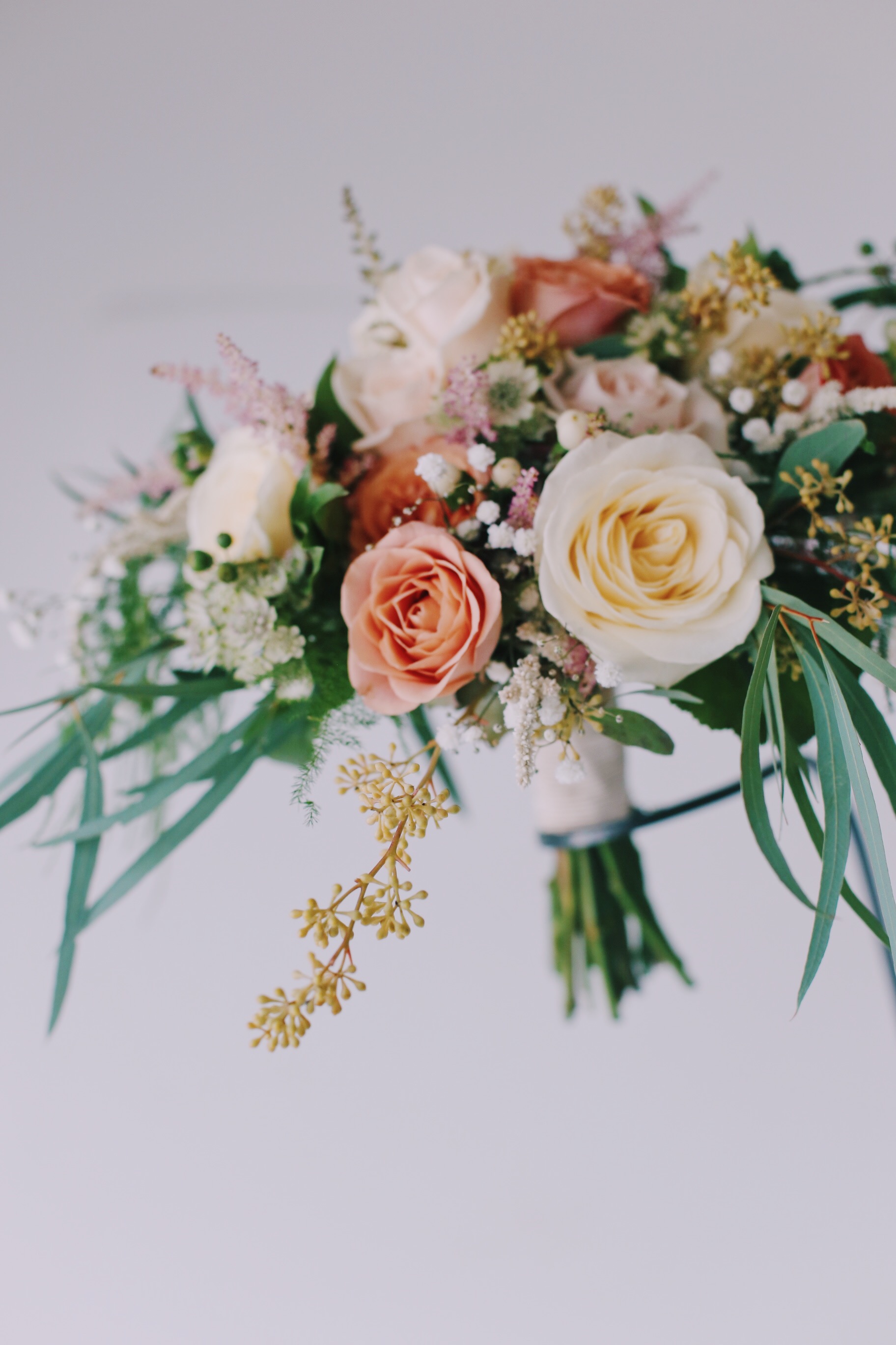 Morsiuskimpussa on erilaisia ruusulajikkeita, mm. rusehtava Capuccino, vaalea Avalanche, kerma Myllena. Lisäksi valkoista kuismanmarjaa (hypericum), valkoista tähtiputkea ( astrantia major) vaaleanpunaista jaloangervoa (astilbe arendsii), eukalyptuksen marjaa, harsokukkaa (gypsophila) ja erilaisia vihreitä.